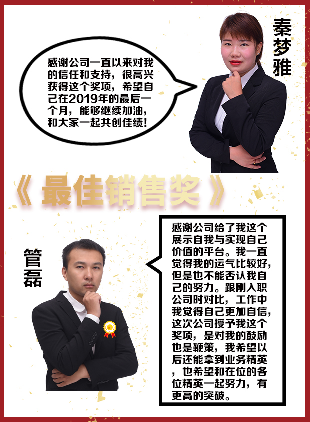 全體員工合唱普天之歌,拉開此次表彰大會(huì)序幕。岳總經(jīng)理向業(yè)務(wù)一部秦夢雅和業(yè)務(wù)二部管磊表示祝賀及感謝,兩位業(yè)務(wù)精英也發(fā)表了自己的獲獎(jiǎng)感言。